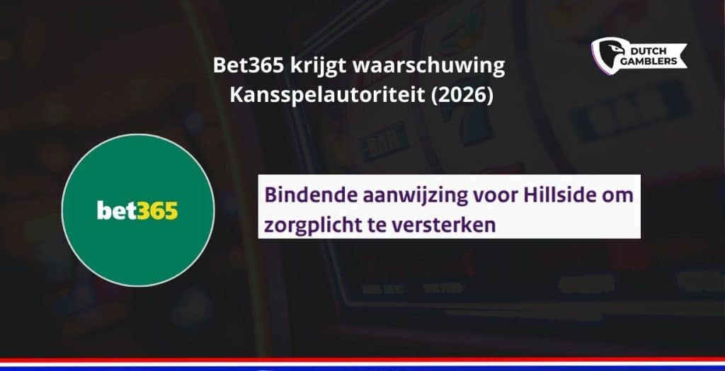 Hillside Media krijgt een waarschuwing van de Kansspelautoriteit. Dit werd gepubliceerd op 22 januari 2026. Hillside Media is het overkoepelende bedrijf van de grote, bekende goksite bet365. Bet365 kreeg een vergunning van de Kansspelautoriteit op 1 oktober 2021 en heeft zich sindsdien keurig gedragen. Bet365 heeft nooit televisiereclames gemaakt, en zich altijd netjes aan de regels gehouden. Dat is waarschijnlijk de reden dat het nu bij een waarschuwing blijft, en niet direct een boete. Verschillende andere legale goksites hebben al wel flinke boetes gehad. Meest recentelijk kreeg ComeOn nog een boete van € 750.000.