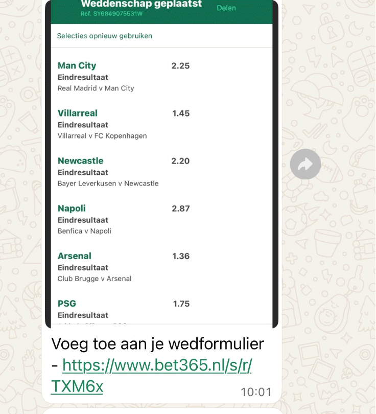 Op 4 februari 2026 deelde de Kansspelautoriteit een artikel met de oproep om te stoppen met ‘Deel je Bet’ functies. Met de ‘Deel je Bet’ Functie, deel je eenvoudig een link van je betslip met andere spelers. Een voorbeeld van een gedeelde bet op WhatsApp: